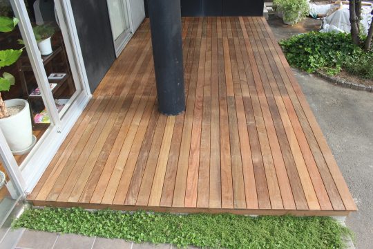 今回は、山梨県内にある商業施設オーナー様よりご依頼頂き、経年劣化した既存ウッドデッキを解体撤去し、イぺ材にて造り替えました。