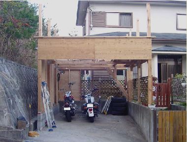 雨ざらしだった駐車スペースに、念願のバイク用ガレージを製作する事にしました。第一段階としてまずは雨風を防げるように屋根、外枠を作りました。今後の第二段階では屋根部分にウッドデッキをはり、上れるようにします。 |