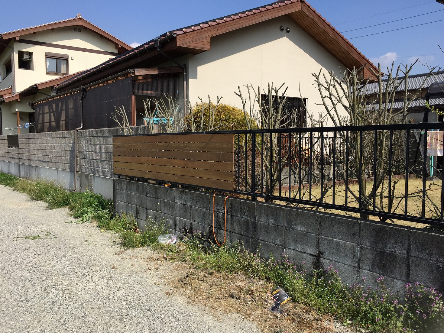 垣根の赤カナメが病気で枯れて道から家が丸見えになった為、イぺの厚7mm×幅105mm購入しアルミフェンスに固定しました。長さ3600mmを28枚購入し、アルミフェンスにドリルネジにて直接打ち込み固定しました。ネジ25mmと65mmを用意し、主柱となっている部分には65mmで、格子となっている部分には25mmで固定しました。板と板の間隔を7mmあけて固定しましたが、ちょうど5段でアルミフェンスに収まり、大変満足した目隠しフェンスになりました。工事時間としては5時間程度でした。